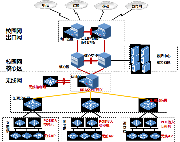 本次设备包含拓扑图中的BRAS、网汇聚交换机、接入交换机、无线控制器等系统。