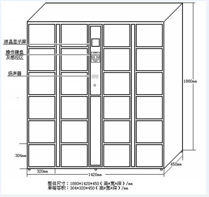 寄存柜柜体选用优质冷轧钢板,厚度不小于0.8mm,经冷加工成形后,用二氧化碳气体保护焊焊接装配。柜体表面经除锈、除油、打磨、磷化处理后喷塑(不接受喷漆)。箱门背面增加纵向加强筋,提高箱门的防撞击能力。箱门两侧呈一定角度的弧线外形,增强箱门的防撞击能力,并且有效防止使用者因疏忽碰伤、磕伤。电控锁采用棘爪式结构,360度防撬、防插。