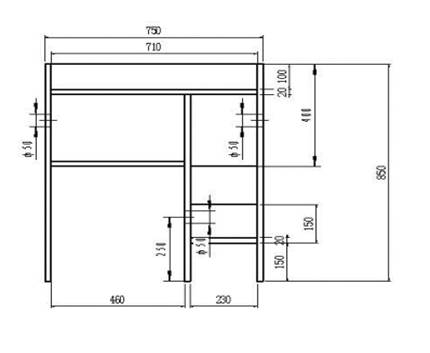 规格:730mm(长)*550mm(宽)*850mm(高) 1. 家具中所涉及到的板材,基材为刨花板,板面为三聚氰胺双面压光榉木纹阻燃饰面板,板材厚度18mm,颜色为银白色,耐压不变形,表面耐磨,正规厂家生产,环保标准达到国家E1级以上(须提供国家相关机构检测证明)。 2.桌面板间连接使用铁三角加固。 3. 计算机是两种款式,本图机箱在右边,另一款机箱在左边。数量:右边28张,左边58张。 4、看样制作。 下图为早期的图,现尺寸仅宽度缩小,730mm(长)*550mm(宽)*850mm(高),即机箱洞缩小2CM。